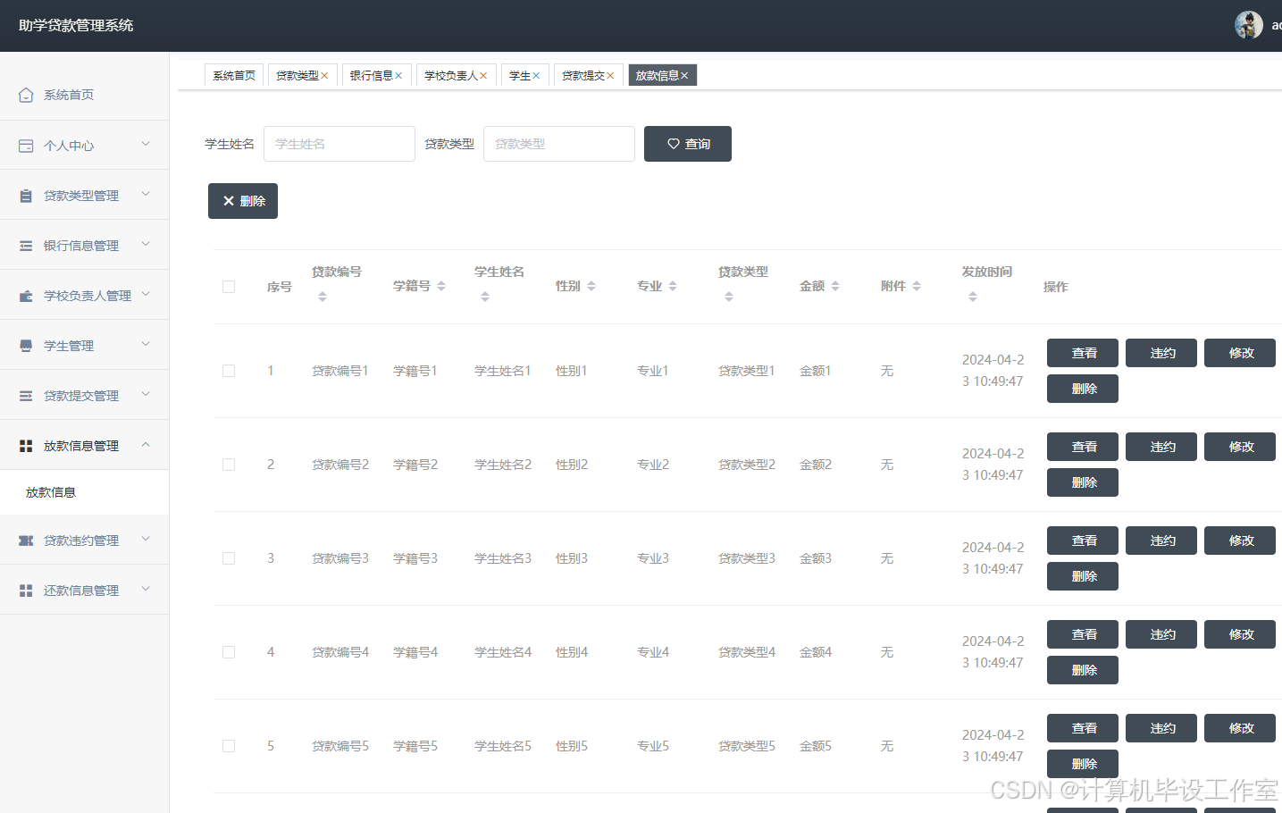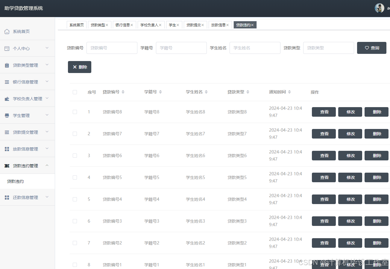 管理员点击“贷款违约”按钮能够对逾期还款的学生进行发布贷款违约信息,管理员有权限对贷款违约信息进行增删改查操作。界面如下图4.11所示。