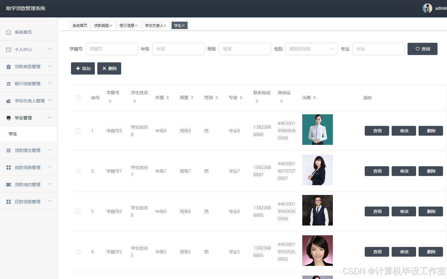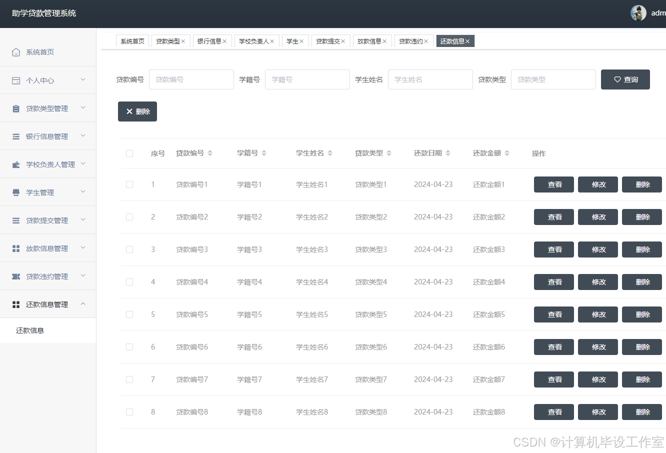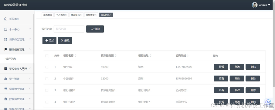 助学贷款管理系统的研究旨在提供一个高效、便捷的平台,用于管理和协调学生的助学贷款工作。该系统利用现代信息技术,结合学校的帮扶政策和流程,帮助学生进行银行助学贷款的线上操作,实现对助学贷款发放和管理的自动化和规范化,确保资金使用透明和合规。本助学贷款管理系统采用了Java语言,基于Springboot框架以及运用了MYSQL数据库开发实现,在功能上分为学生用户,学校负责人和管理员三部分,主要功能模块有银行信息管理、贷款提交管理、放款信息管理、贷款违约管理、还款信息管理等。