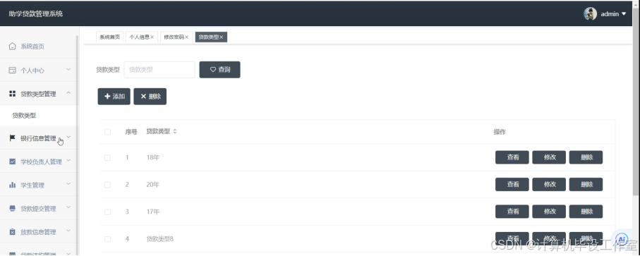 管理员点击“贷款类型管理”菜单下单“贷款类型”按钮可以查看到所有的贷款类型列表,如果想要填写新的贷款类型,点击右上角“添加”按钮,然后输入贷款类型,点击“提交”按钮进行提交,同时也支持对已有的贷款类型进行删除和查询。贷款类型界面如下图4.4所示。
