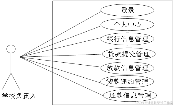 学校负责人想要使用系统功能必须进行注册,注册完成后方可登录系统,方可进行相关操作,包括个人中心、银行信息管理、贷款提交管理、放款信息管理、贷款违约管理、还款信息管理。