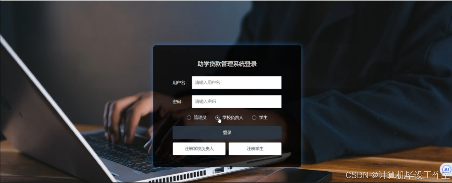 助学贷款管理系统中的管理员,学校负责人以及学生用户,想要对系统模块进行查询管理操作,必须登录到系统当中,每个用户对于各自的功能权限,使用者输入账号、密码,点击“登录”按钮进行登录;在登录界面使用者忘记密码,也支持新的学生用户进行注册,登录界面展示如下图4.1所示。