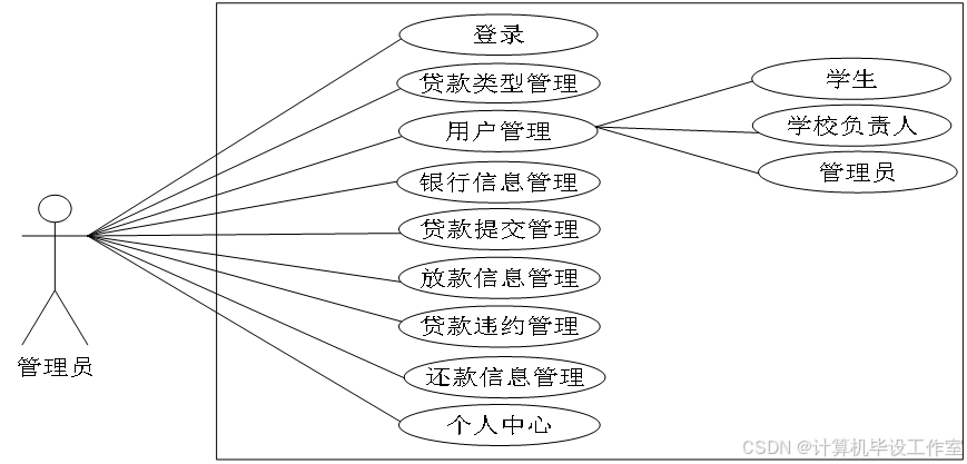 通过构建用例图,来更好的展示出管理员这个角色所有的功能,如下。