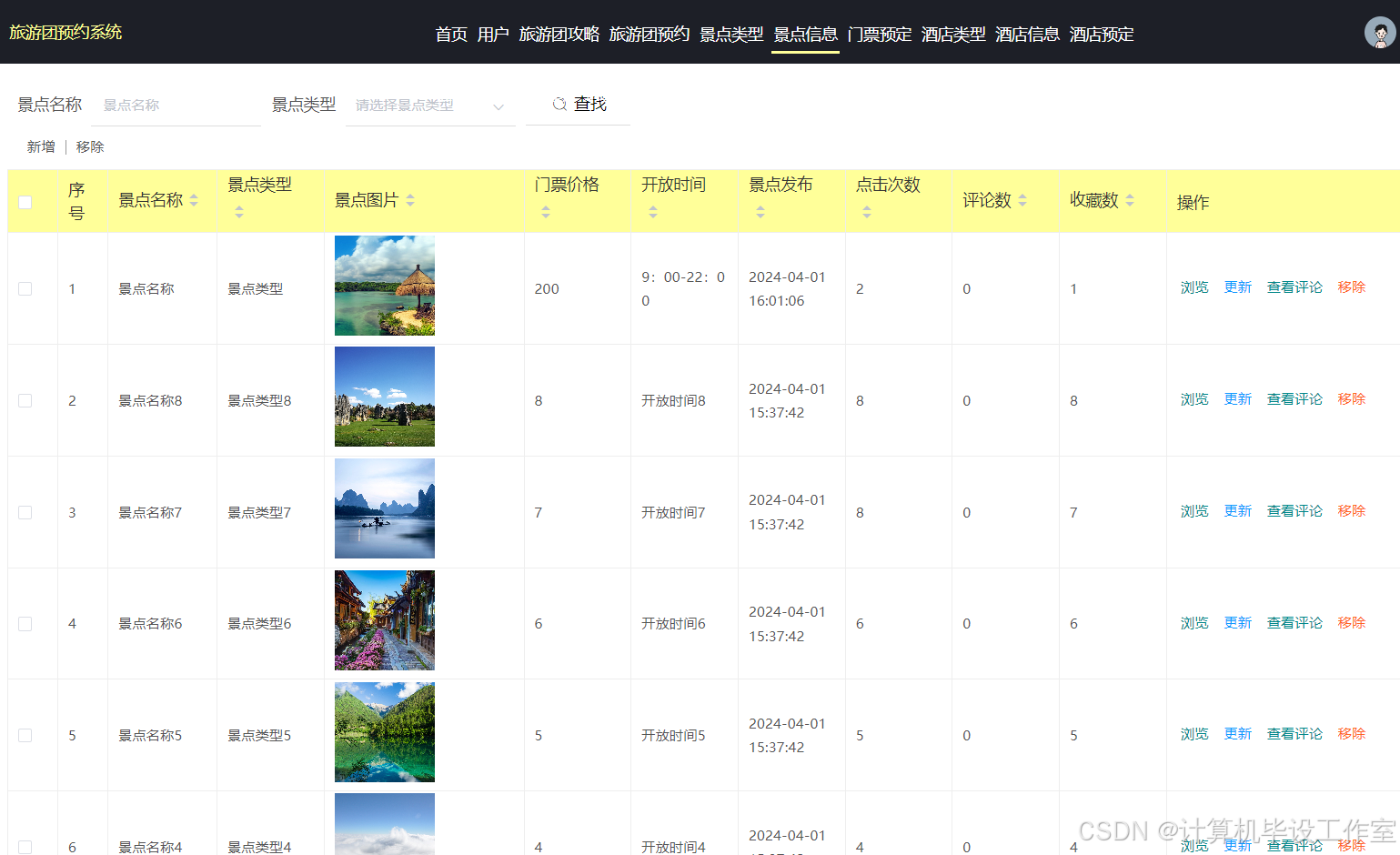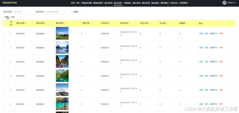 管理员在“景点信息”这一菜单会显示所有景点信息,管理员可以对景点信息进行新增、浏览、更新、移除以及查看评论,界面如下图4-13所示。