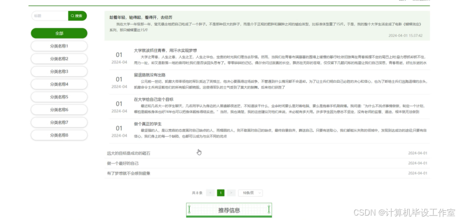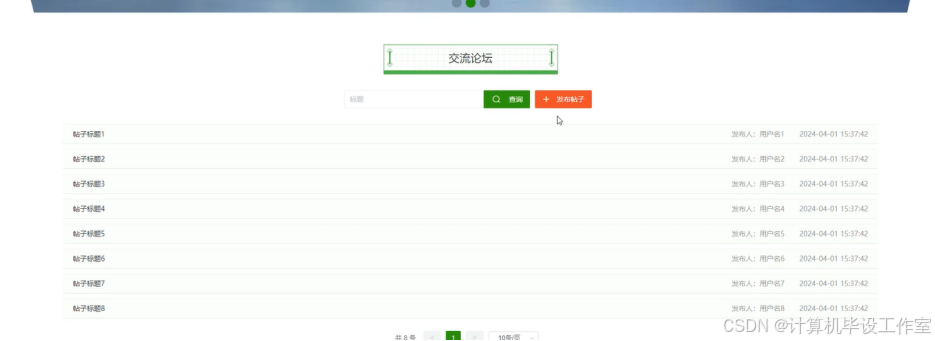 (6)交流论坛:用户点击“交流论坛”菜单显示所有的交流论坛信息,可以按照分类查看帖子信息,点击可以进入帖子的详细展示界面,也可以点击“发布内容”输入帖子信息进行发帖。