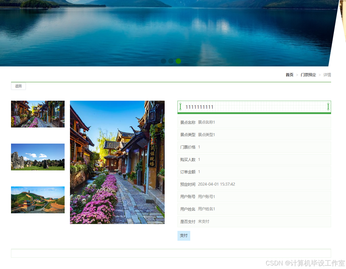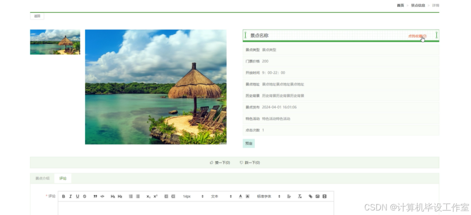 (3)景点信息:用户可以查看景点信息,在查询到自己想要了解的景点的时候,可以进入查看详细的介绍,点击“门票预定”这一按钮以后会跳转到门票预定信息填写的界面,根据提示填写好门票预定的信息,点击“提交”以后门票预定就完成了,在景点详情这个界面,同时支持用户对喜欢的景点进行收藏、点赞以及评论的功能。