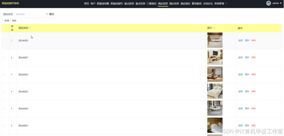 (6)酒店类型:管理员可以对酒店类型进行浏览、新增、移除、更新。