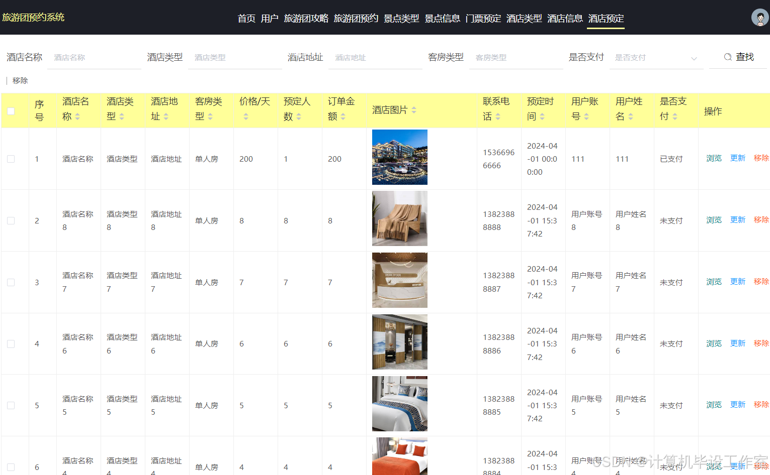(8)酒店预定:管理员可以对酒店预定进行管控。