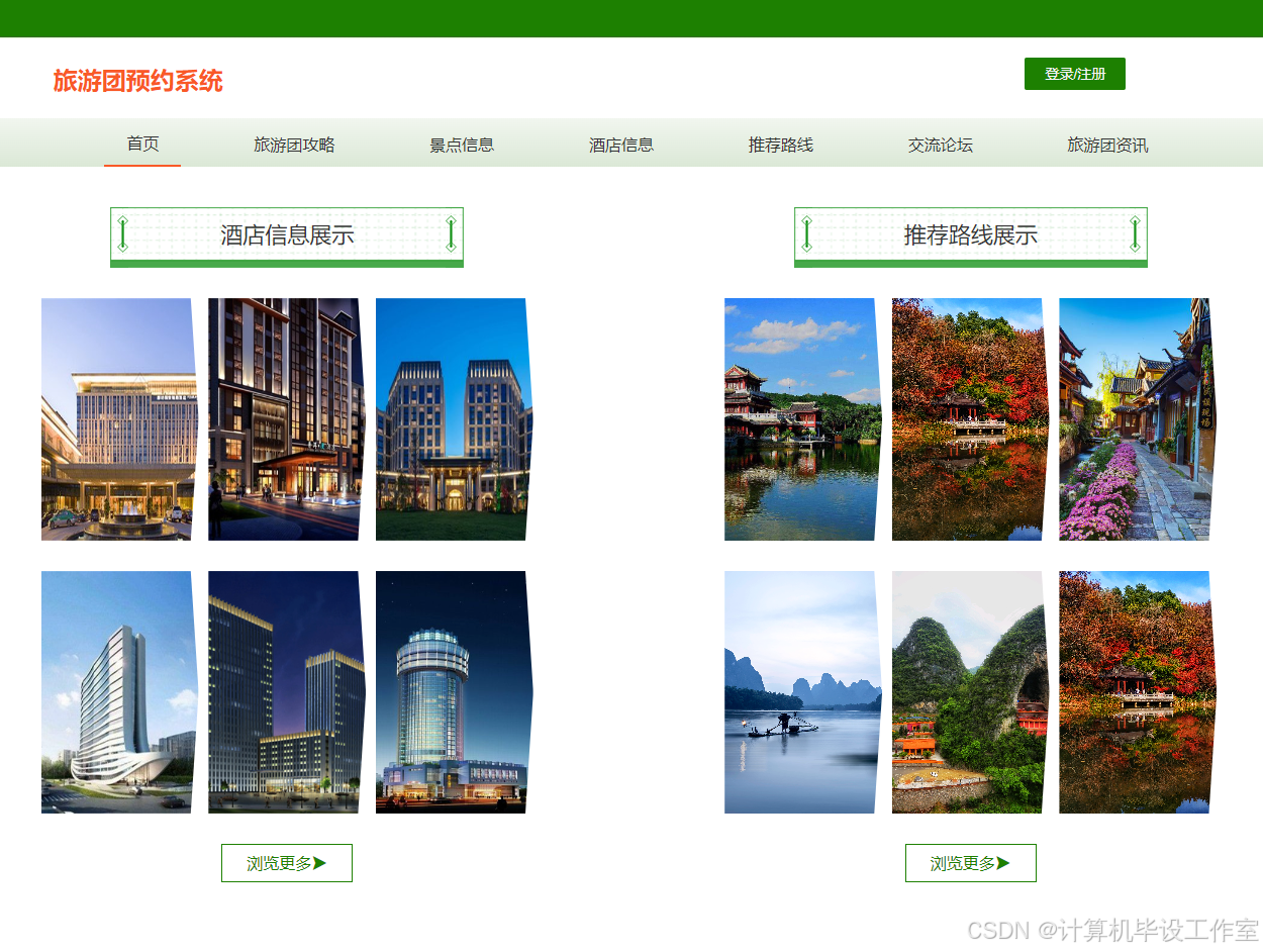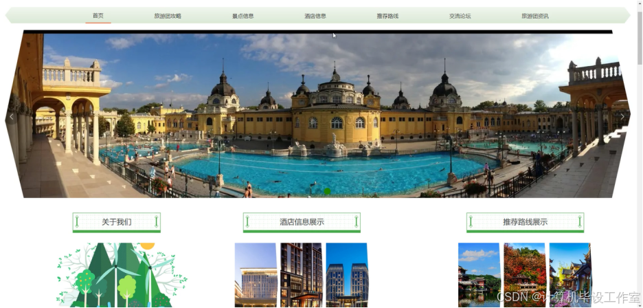 (2)查看旅游团预约系统的首页信息:旅游团预约系统的首页信息包含了首页、景点信息、酒店信息、推荐路线、交流论坛、旅游团攻略、旅游团资讯等。