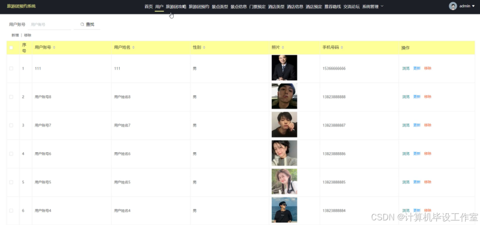 旅游团预约系统中的管理人员在“用户管理”这一菜单是中可以对注册的游客用户进行新增、浏览、更新、移除,界面如下图4-11所示。