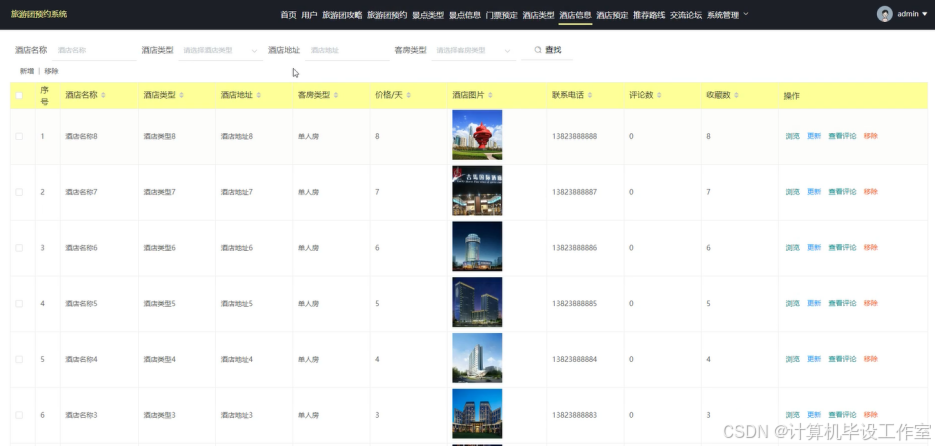 (5)酒店信息:管理员可以对其进行浏览、新增、移除、更新操作,还可以管理评论信息。