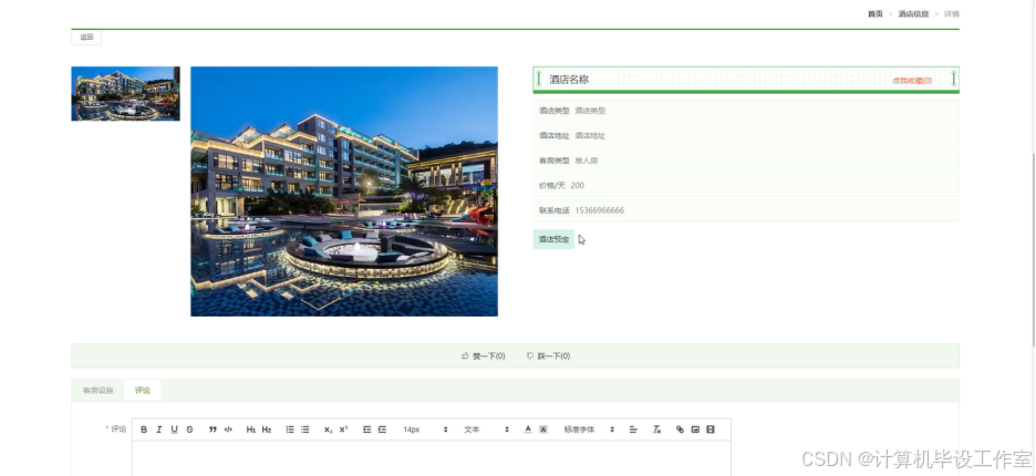 用户点击“酒店信息”菜单可以查看所有酒店信息,可以按照条件查看酒店信息,或者输入关键词进行查询,点击可以进入酒店信息详细展示界面,在此界面用户可以酒店预定、收藏和评论。酒店信息详情界面如下图4-7所示。