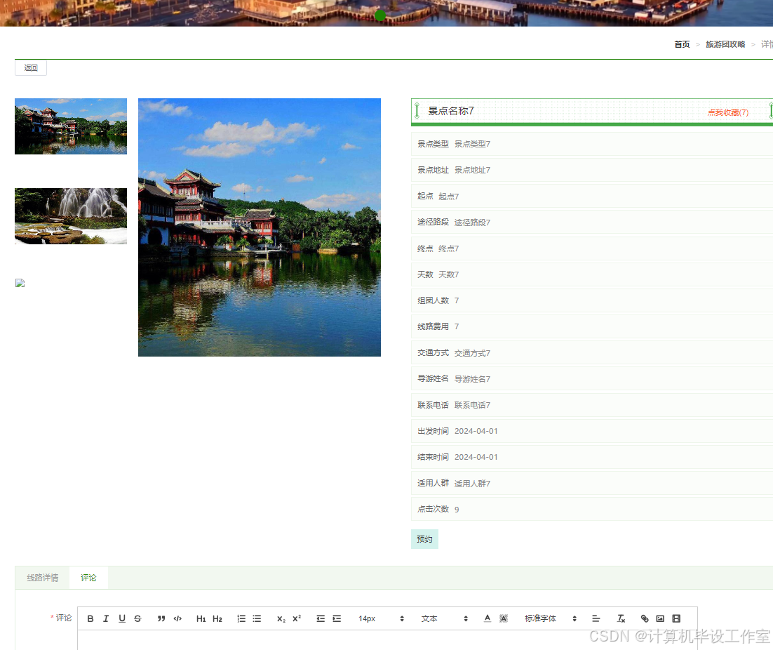 当访客点击“旅游团攻略”后就可以看到所有的旅游团攻略,可以输入路线费用进行搜索查询,选择你想要了解的旅游团攻略后将会进入该款旅游团攻略的详情介绍界面,可以了解到该旅游团攻略的组团人数、路线费用、导游姓名、联系电话、出发时间、结束时间、适用人群等,同时可以对点击下方的“预约”、“收藏”进行相关操作,也可以在下方评论区输入想要评论的内容进行评论,旅游团攻略详情界面如下图4-4所示。