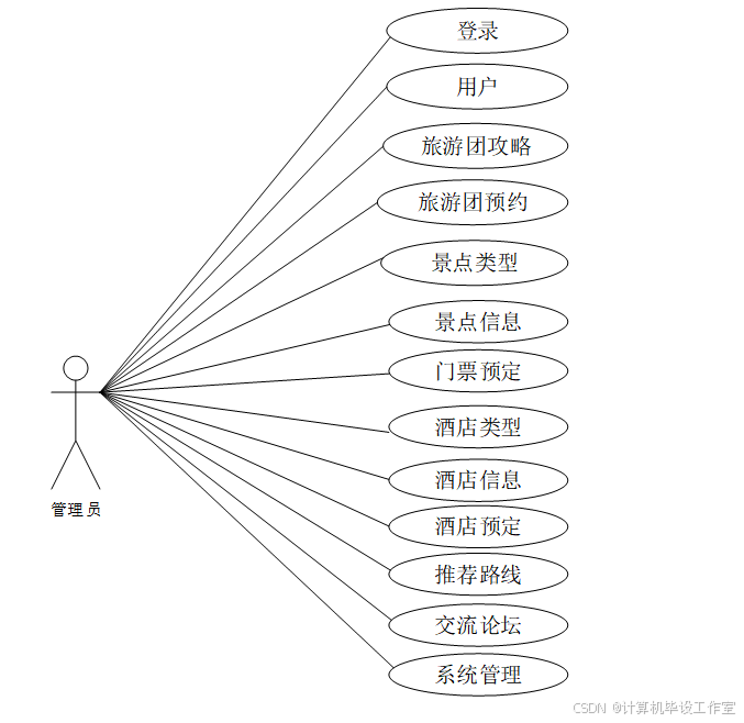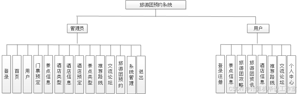 旅游团预约系统划分为用户管理和管理员这两大部分。