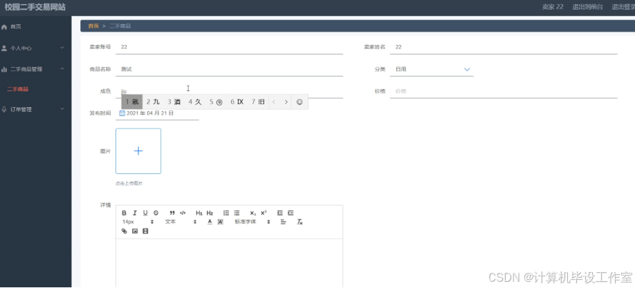 卖家登录后,可以发布二手商品。界面如下图所示: