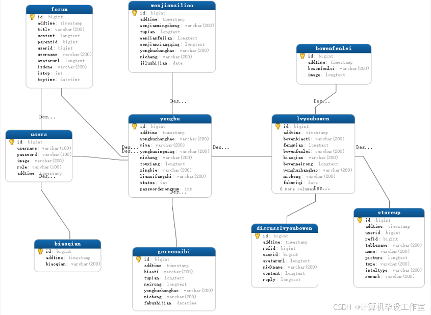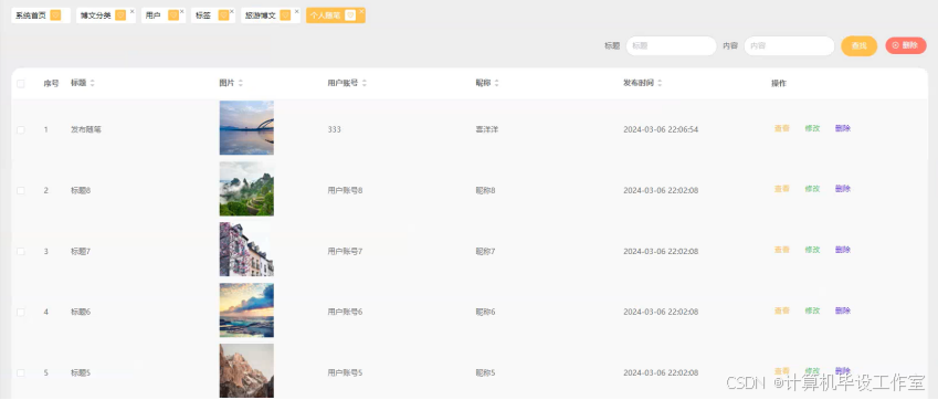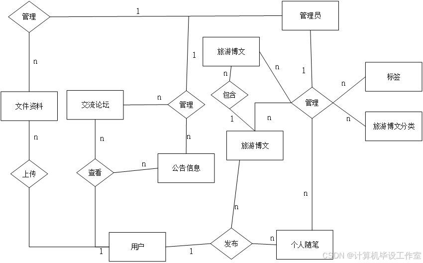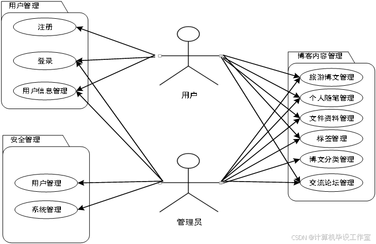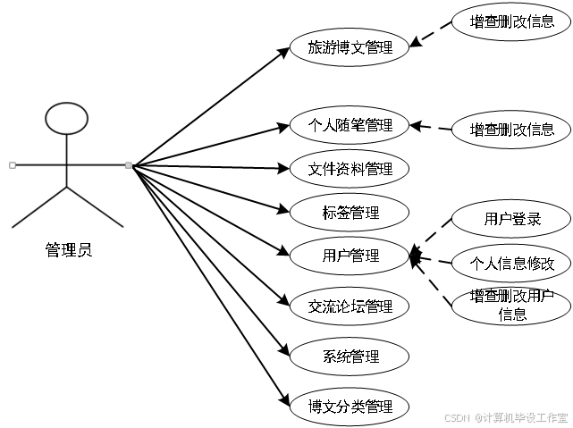 | 管理员 | 管理员用户管理、旅游博文管理、统管理、博文分类管理、标签管理、文件资料管理、个人随笔管理、交流论坛管理等进行管理,包括新增、修改、删除、查看等操作 | 用户管理、旅游博文管理、文件资料管理、个人随笔管理、交流论坛管理、系统管理、博文分类管理、标签管理 |