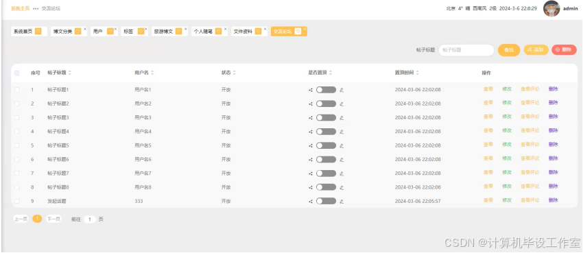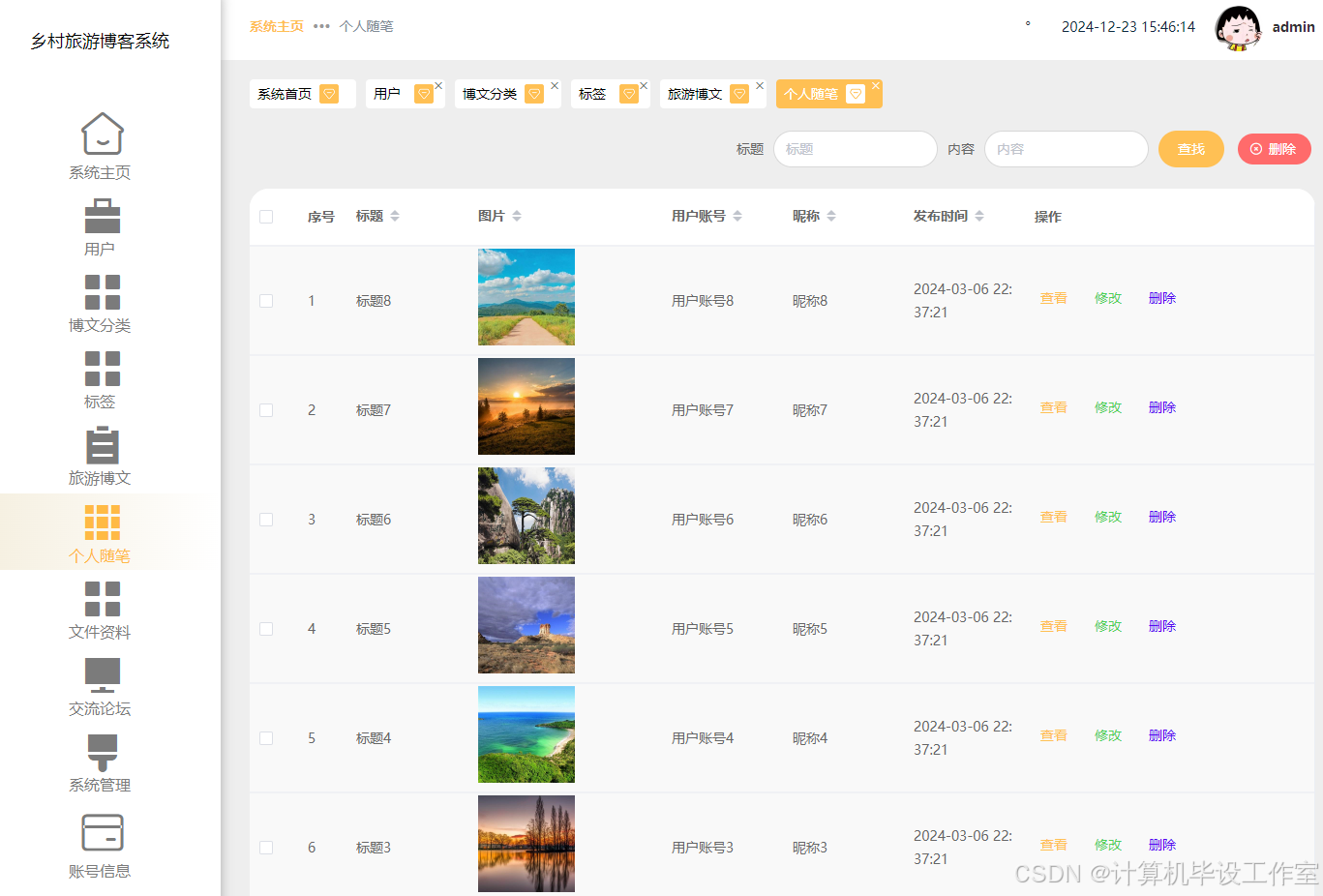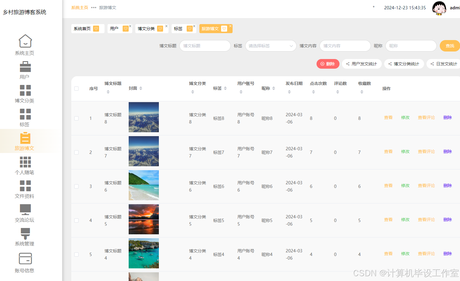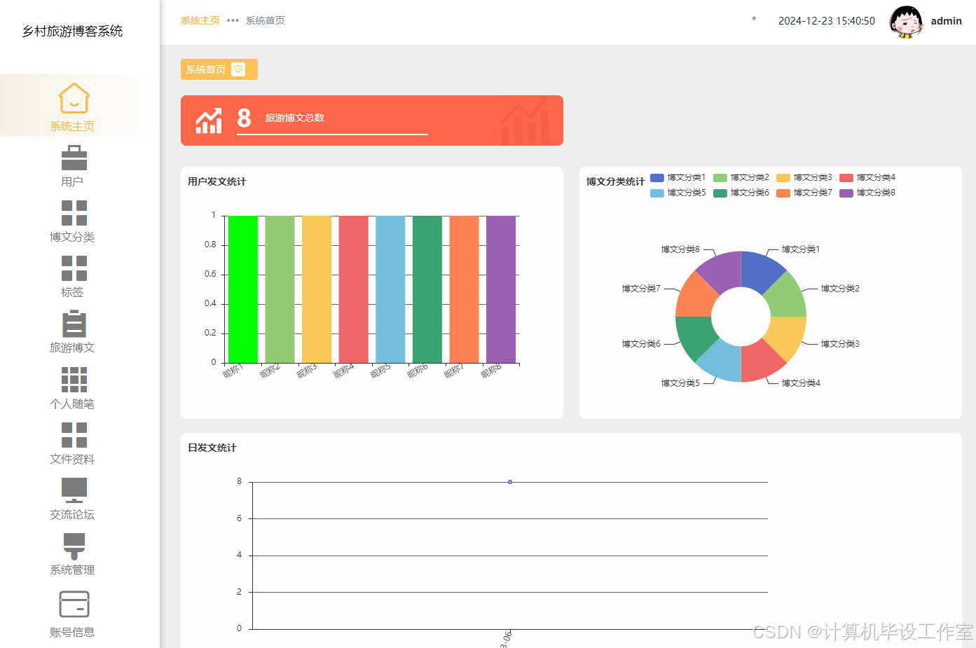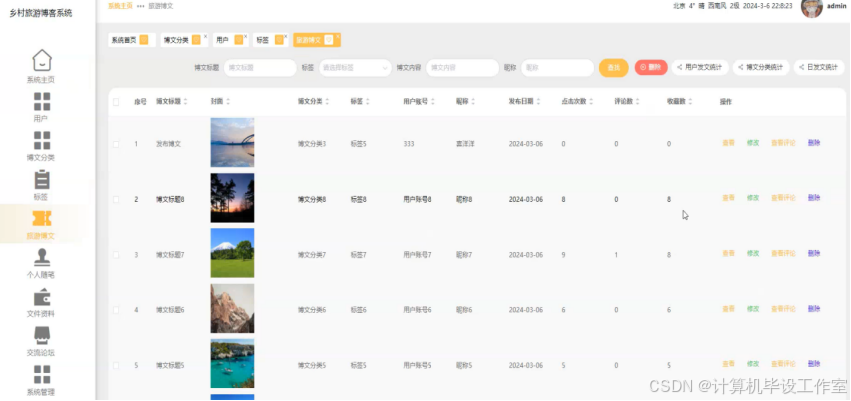 (2)管理员功能包括:用户注册登录、系统主页,用户,博文分类,标签,旅游博文,个人随笔,文件资料,交流论坛,系统管理,账号信息等。