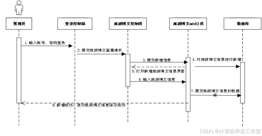 | 操作步骤 | (1)管理员点击添加按钮; (2)管理员填写旅游博文; (3)管理员保存旅游博文; | ||