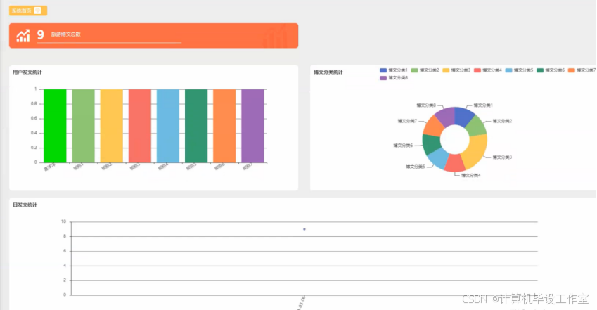 数据统计模块管理功能负责对博客系统的各项数据进行统计和分析,包括用户发文统计、日发文统计、博文分类统计等。这些数据可以用于评估系统的运行状态、用户行为以及博文的质量等,为系统的优化和决策提供数据支持。