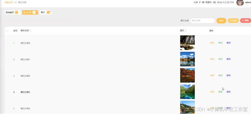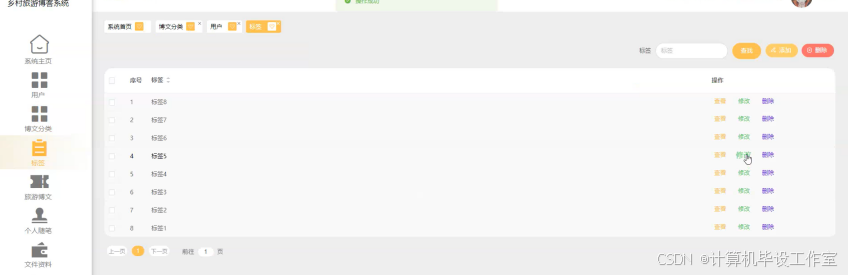 乡村旅游作为现代旅游的重要组成部分,其推广与发展对于促进农村经济和文化建设具有重要意义。然而,缺乏有效的信息交流平台限制了乡村旅游资源的传播和分享。本研究旨在构建基于Spring Boot和Vue的乡村旅游博客系统,为乡村旅游爱好者提供一个便捷的交流平台。系统采用Spring Boot作为后端框架,实现业务逻辑处理和数据库交互;Vue作为前端框架,负责界面展示和用户交互。通过前后端分离的设计,提高了系统的可维护性和扩展性。在功能实现上,系统实现了用户管理、博文发布与展示、标签与分类管理、交流论坛等核心功能,满足了用户发布和浏览博文、互动交流的需求。同时,系统还提供了友好的用户界面和流畅的用户体验,增强了用户粘性。基于Spring Boot和Vue的乡村旅游博客系统为乡村旅游文化的传播和发展提供了有力支持。通过该系统,用户可以方便地记录和分享乡村旅游体验,促进乡村旅游资源的共享和互利。