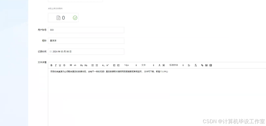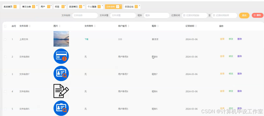 文件资料管理功能用于管理用户上传的文件,如图片、文档等。该功能支持文件的上传、下载、预览、编辑和删除等操作,并可以对文件进行版本控制和权限管理,确保文件的安全性和完整性。此外,文件资料管理还支持文件的备份和恢复,防止数据丢失。