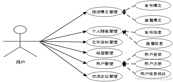 | 用户 | 使用乡村旅游博客系统的普通用户,可以浏览乡村旅游博文、发表博文、发表个人随笔、上传文件资料以及修改个人信息 | 用户管理、旅游博文管理、文件资料管理、个人随笔管理、交流论坛管理 |