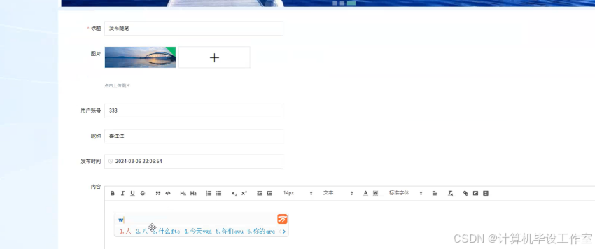 旅游博文管理和个人随笔管理功能分别针对博客系统中的旅游博文和个人随笔进行创建、编辑、删除、查看等操作。这些功能允许用户轻松发布和管理自己的博文或随笔,同时提供博文或随笔的分类、标签、评论等附加功能,增强用户间的互动和信息分享。