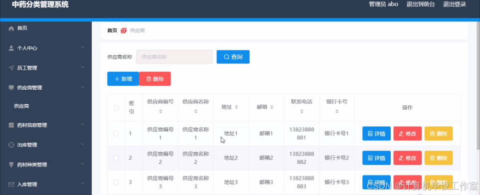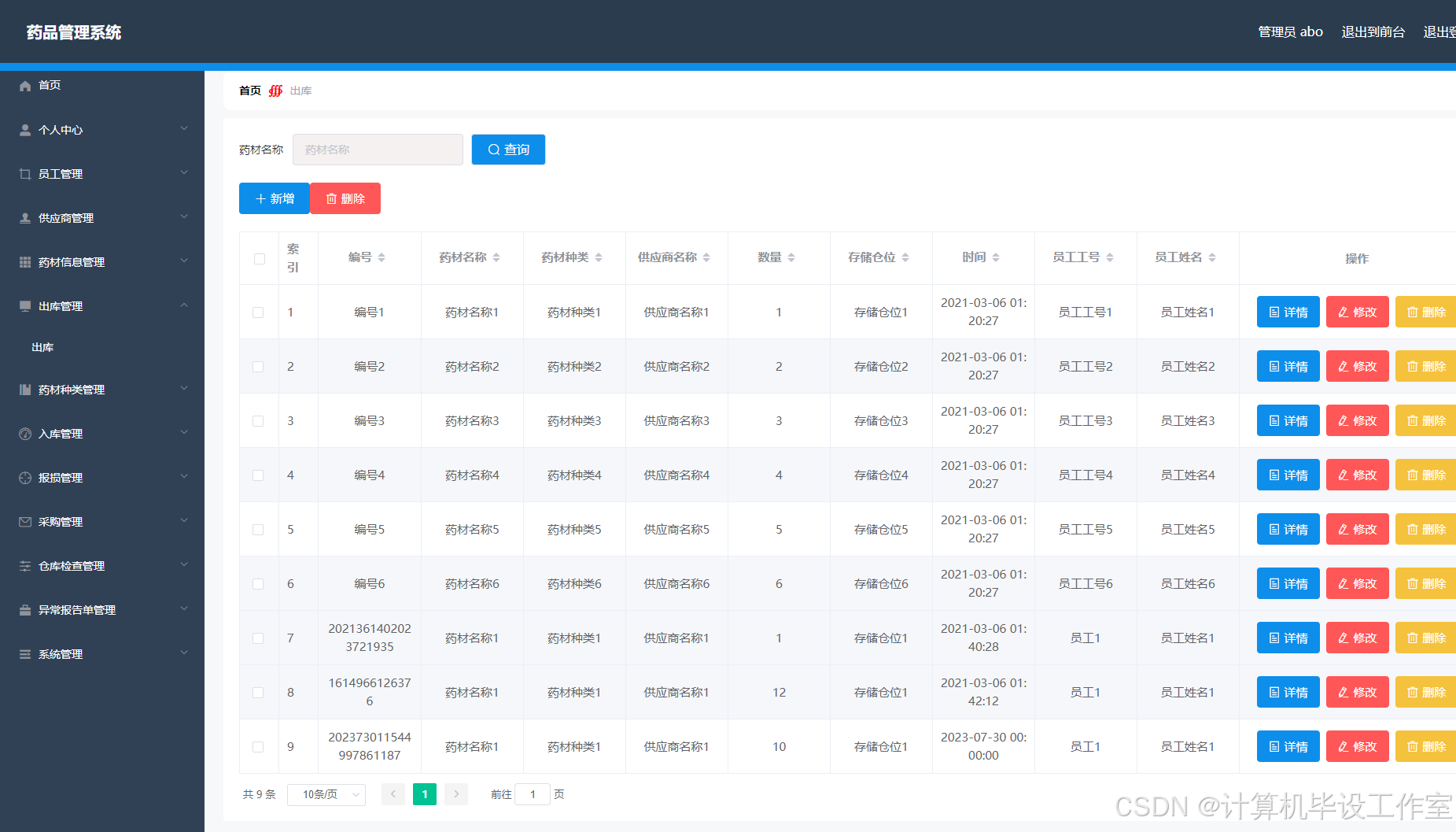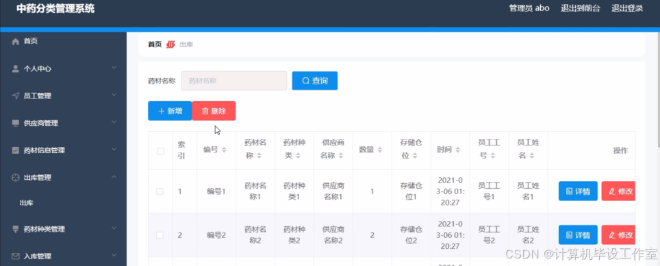 出库管理,在出库管理中通过填写编号、药材名称、药材种类、供应商名称、数量、存储仓位、时间、员工工号、员工姓名等信息并详情、删除,如图5-13所示。