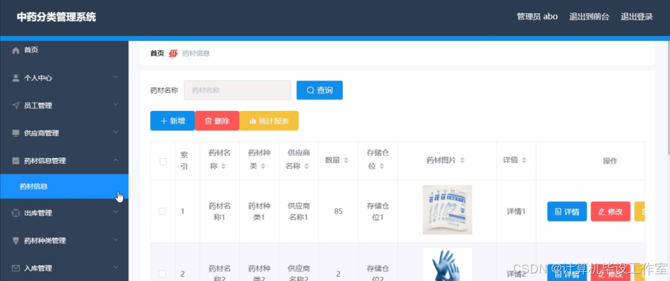 中药分类管理系统的开发过程中,采用B / S架构,主要使用Java技术进行开发,结合最新流行的SSM框架。中间件服务器是Tomcat服务器,使用Mysql数据库和Eclipse开发环境。该中药分类管理系统包括员工和管理员。其主要功能包括管理员:首页、个人中心、员工管理、供应商管理、药材信息管理、出库管理、药材种类管理、入库管理、报损管理、采购管理、仓库检查管理、异常报告单管理、系统管理,前台首页;首页、药材信息、个人中心、后台管理,员工:首页、个人中心、药材信息管理、出库管理、入库管理、报损管理、采购管理、仓库检查管理、异常报告单管理等功能。