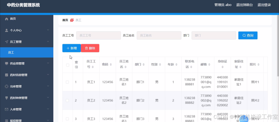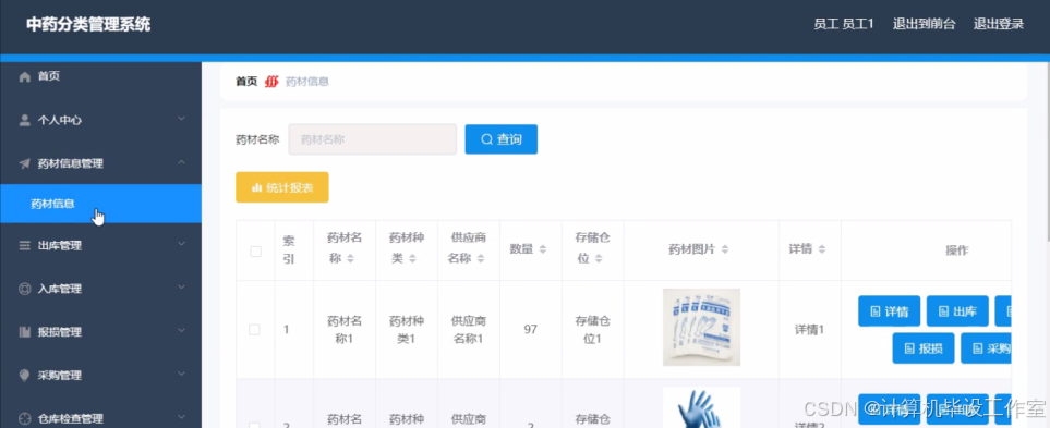 管理员登录进入中药分类管理系统可以查看首页、个人中心、员工管理、供应商管理、药材信息管理、出库管理、药材种类管理、入库管理、报损管理、采购管理、仓库检查管理、