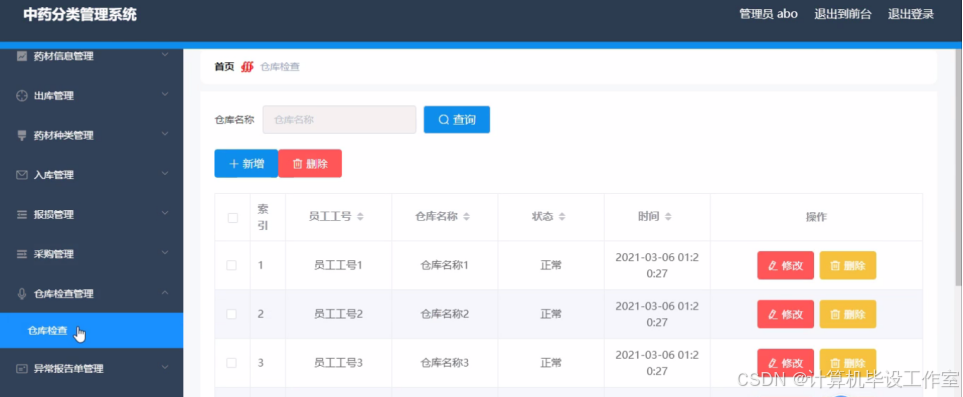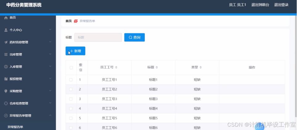 员工登录进入中药分类管理系统可以查看首页、个人中心、药材信息管理、出库管理、入库管理、报损管理、采购管理、仓库检查管理、异常报告单管理等内容,如图5-12所示。