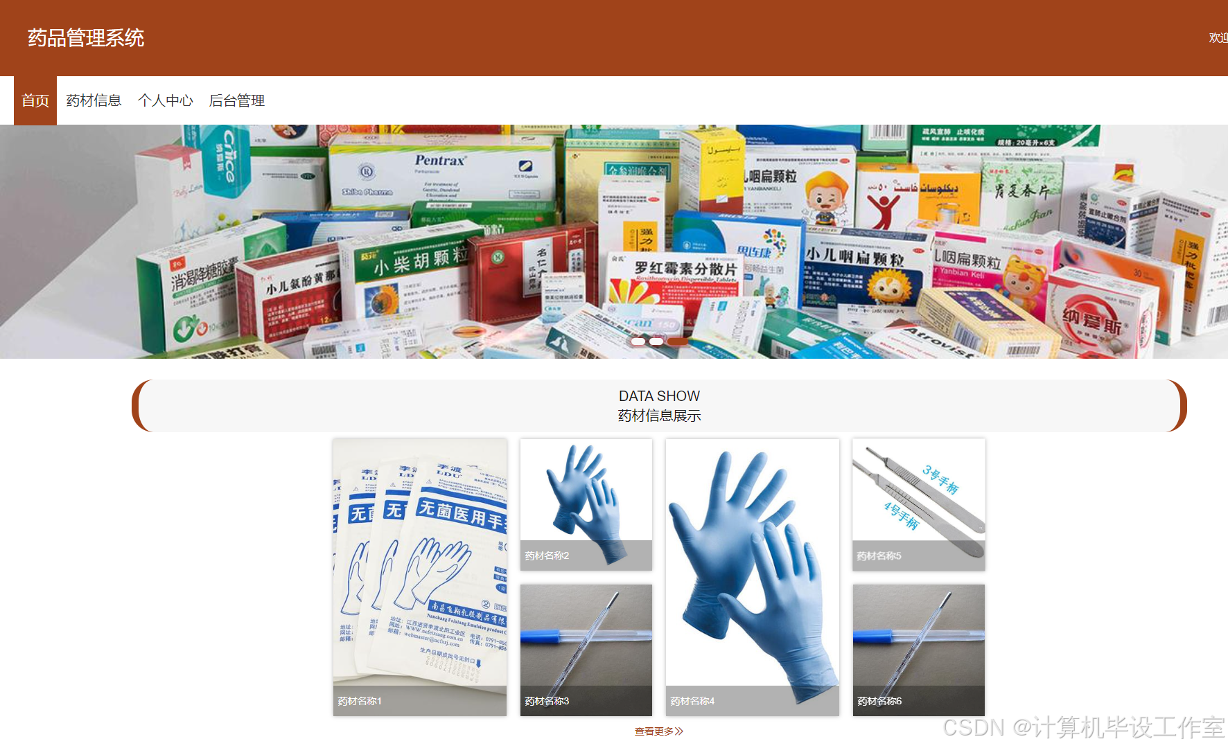 中药分类管理系统,在系统首页可以查看首页、药材信息、个人中心、后台管理等内容,如图5-1所示。