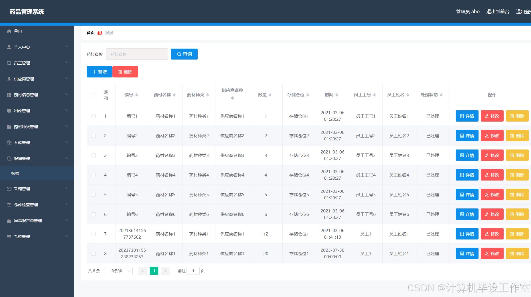 采购管理,在采购管理可以查看编号、药材名称、药材种类、供应商名称、数量、存储仓位、时间、员工工号、员工姓名、处理状态等内容,并且根据需要进行详情、修改、删除操作,如图5-11所示。