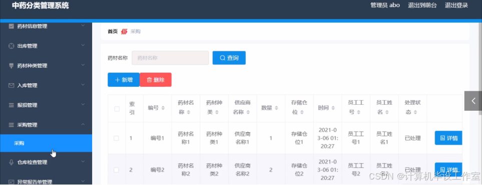 采购管理,在采购管理中通过填写编号、药材名称、药材种类、供应商名称、数量、存储仓位、时间、员工工号、员工姓名、处理状态等信息详情、删除,如图5-14所示。