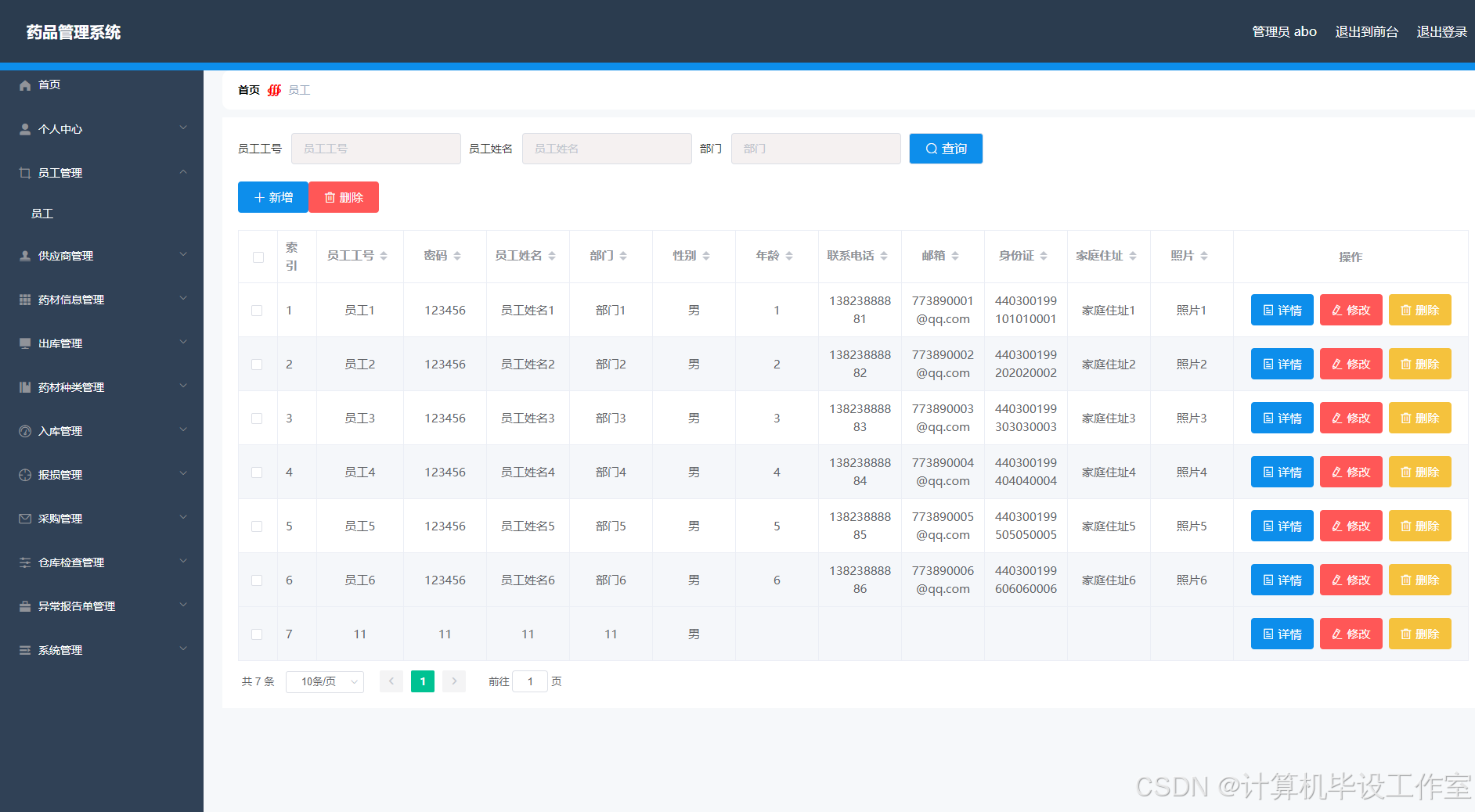 (2)管理员功能:员工管理、供应商管理、药材信息管理、出库管理、药材种类管理、入库管理、报损管理、采购管理、仓库检查管理、异常报告单管理、系统管理