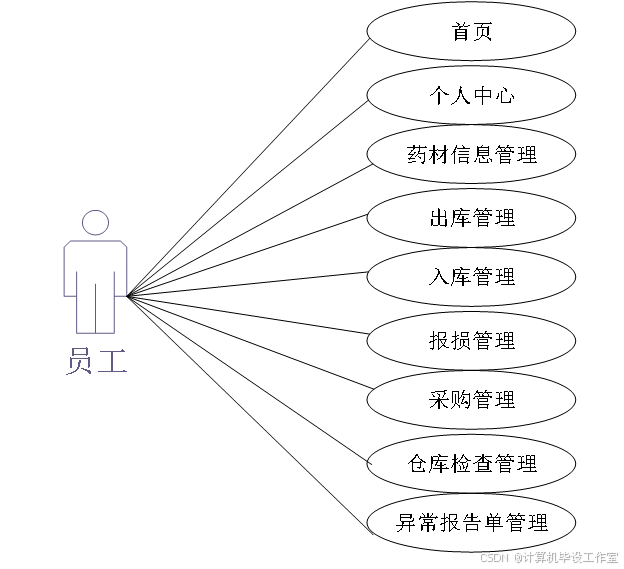 员工进入系统可以查看首页、个人中心、药材信息管理、出库管理、入库管理、报损管理、采购管理、仓库检查管理、异常报告单管理等操作。员工用例图如图3-1所示。