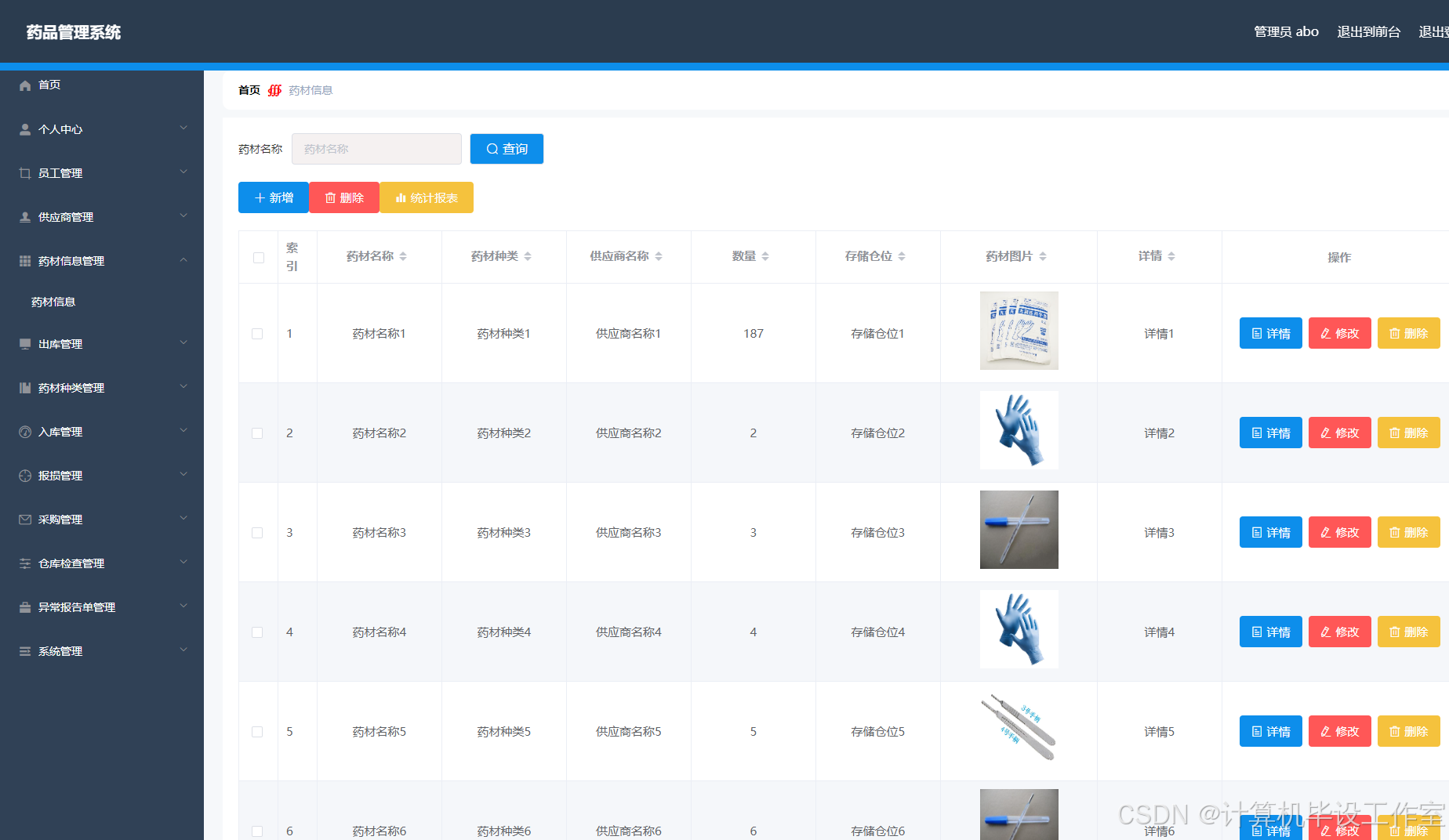 药材信息,在药材信息页面通过填写药材名称、药材种类、供应商名称、数量、存储仓位、药材图片、详情等信息进行出库、入库、报损、采购,如图5-3所示。