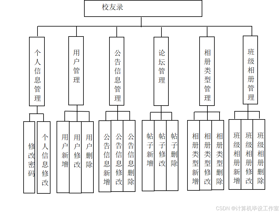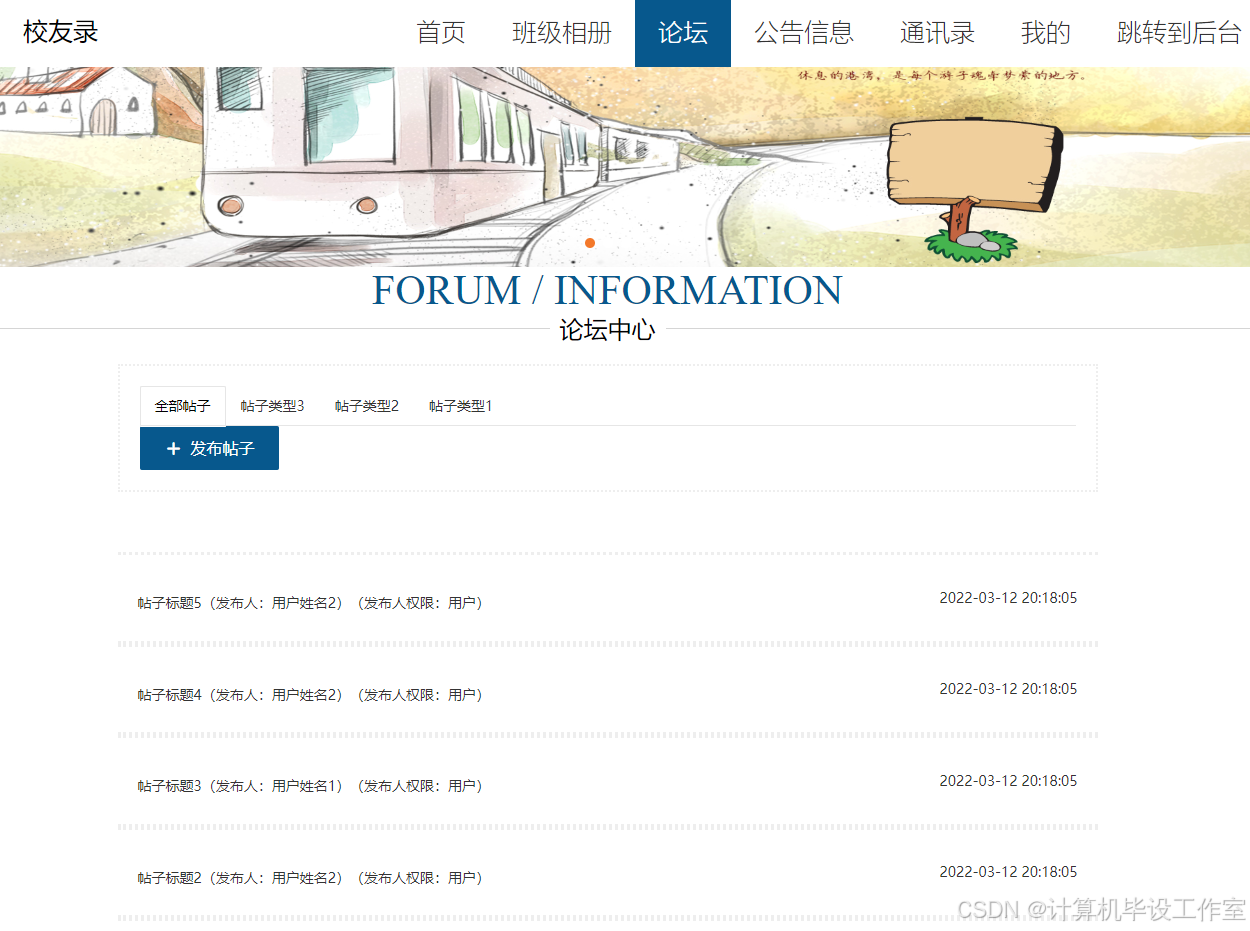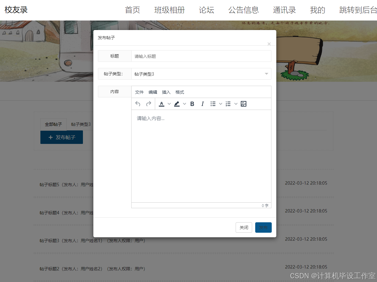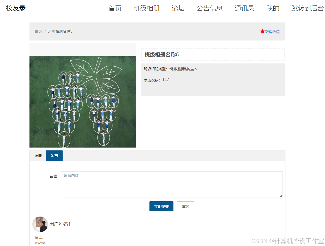 (1)前台用户可以进行注册登录、个人中心、浏览班级相册以及留言、论坛发帖、公告信息、通讯录等功能