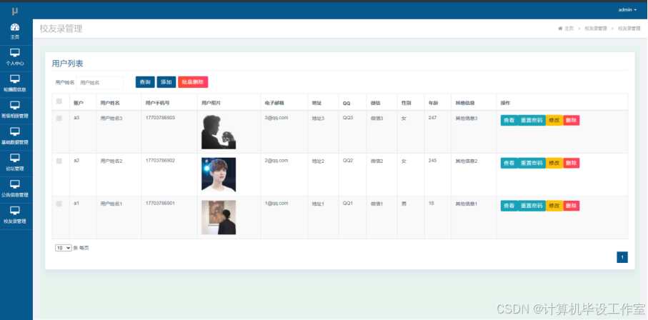 此页面让管理员管理用户管理的数据,用户管理管理页面见下图。此页面主要实现用户管理的增加、修改、删除、查看的功能。