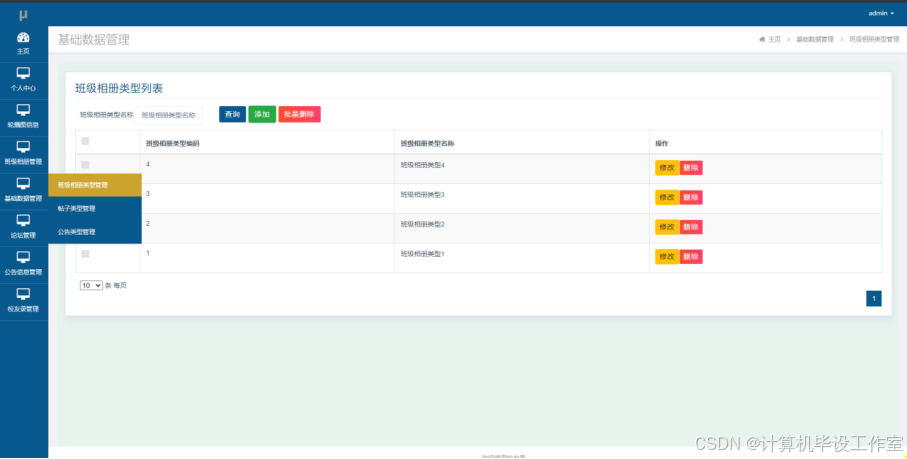 班级相册类型管理页面显示所有班级相册类型,在此页面既可以让管理员添加新的班级相册信息类型,也能对已有的班级相册类型信息执行编辑更新,失效的班级相册类型信息也能让管理员快速删除。下图就是班级相册类型管理页面。