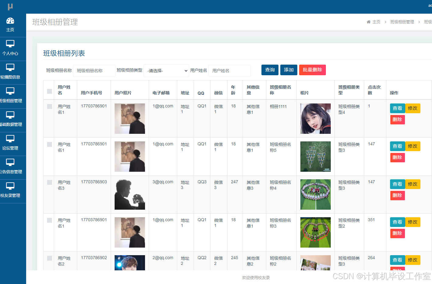 班级相册信息管理页面提供的功能操作有:新增班级相册,修改班级相册,删除班级相册操作。下图就是班级相册信息管理页面。