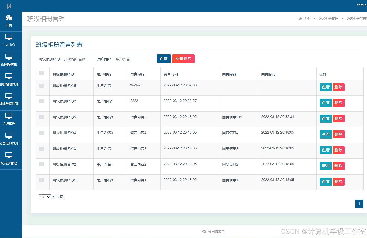 (2)管理员可以进行班级相册管理、班级相册收藏管理、班级相册留言管理、字典管理、论坛管理、班级相册信息管理、用户管理、管理员管理等功能。