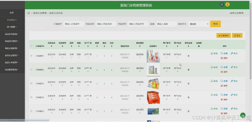如图5.19所示,用户点击退药记录管理按钮,进入到退药记录管理界面。如图5.20所示,管理员负责审核用户提交的退药申请。在审核过程中,管理员只需点击审核按钮,并根据实际情况选择相应的审核状态,然后点击提交按钮即可完成审核操作。一旦审核通过,退药申请便会被视为成功处理。