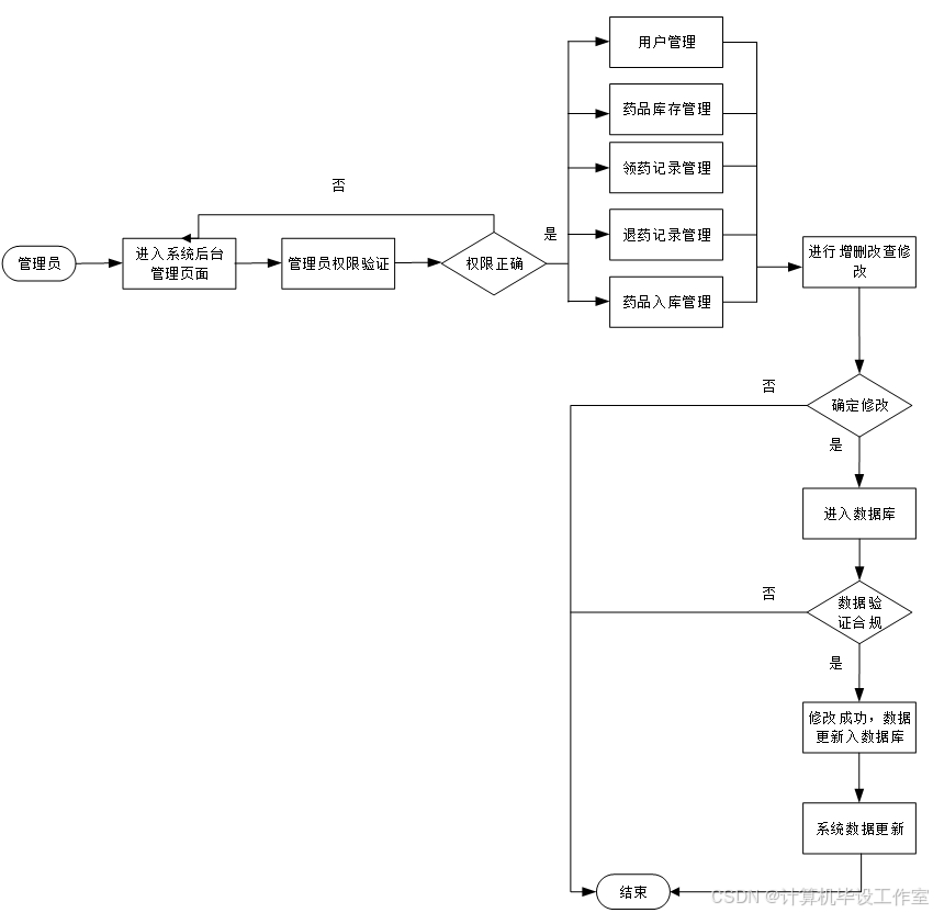 (2)管理员模块则聚焦于用户账号的管理(如新增、删除、修改等)、个人信息查看、药品库存管理、药品类型管理、领药与退药记录管理、药品入库管理以及药品报损管理等核心任务。