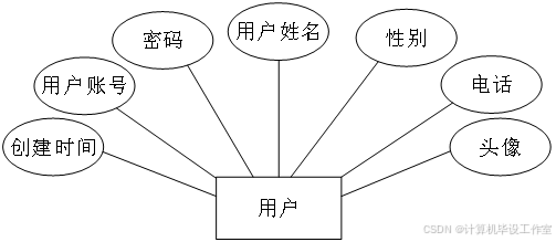 用户实体包含了多个关键属性,如用户账号、密码、姓名、性别以及电话号码等,这些属性共同描述了用户的身份信息和登录凭证。