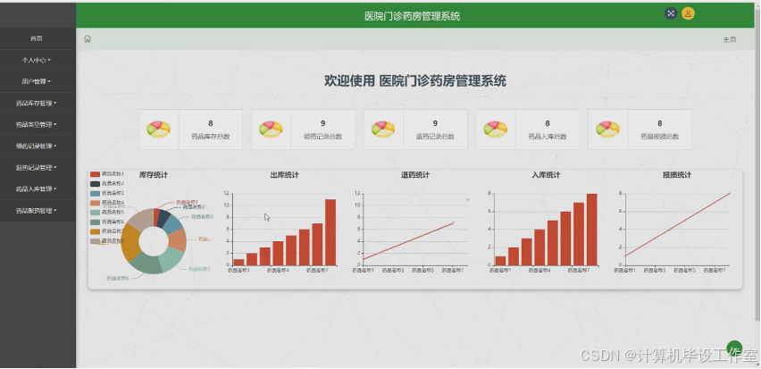 如图5.10所示,管理员成功登录后,首先映入眼帘的是后台管理系统的首页。首页左侧精心设计的竖排导航栏,涵盖了首页、个人中心、用户管理、药品库存管理、药品类型管理、领药记录管理、退药记录管理、药品入库管理以及药品报损管理等丰富功能按钮。管理员只需轻轻一点,即可迅速进入对应的管理界面,执行各项操作。首页界面还巧妙地融入了可视化图表,直观展示了系统药品库存综述、领药记录总数、退药记录总数、药品入库总数以及药品报损总数等关键数据。此外,库存统计的环形图、出库统计的柱状图、退药统计的折线图、入库统计的柱状图以及报损统计的折线图等,不仅让数据一目了然,还能根据系统使用情况实时更新,为管理员提供了极大的管理便利。