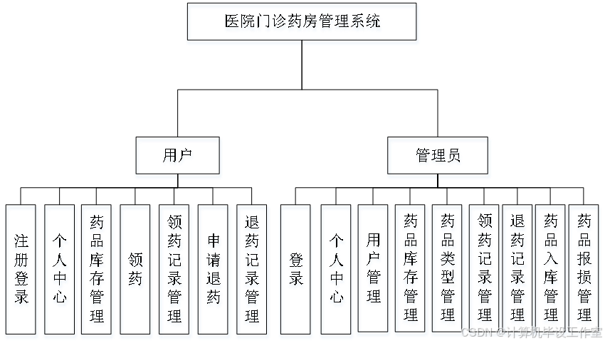 医院门诊药房管理系统主要由两大模块构成:用户模块和管理员模块。