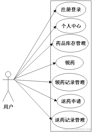(1)用户模块涵盖了用户的注册登录、个人信息查看与修改、药品库存查看、药品领取、退药申请以及领养和退药记录查询等功能。