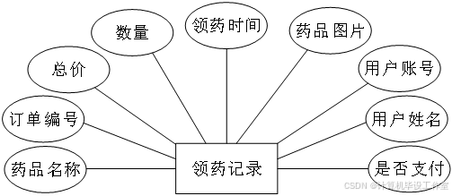 领药记录实体涵盖了丰富的属性信息,如药品名称、订单编号、总价、数量、领药时间以及药品图片等,这些属性共同构成了领药记录的完整细节。