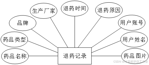 退药记录实体包括药品名称,药品类型,品牌,生产厂家,退药时间,退药原因等属性,如图4.10所示。