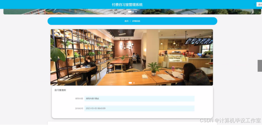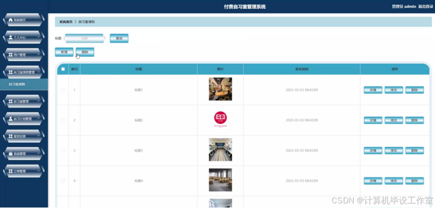 用户点击自习室准则,在自习室准则页面的输入栏中填写标题,进行查询,还可以查看标题、图片、发布时间等信息进行详细操作,如图5-4所示: